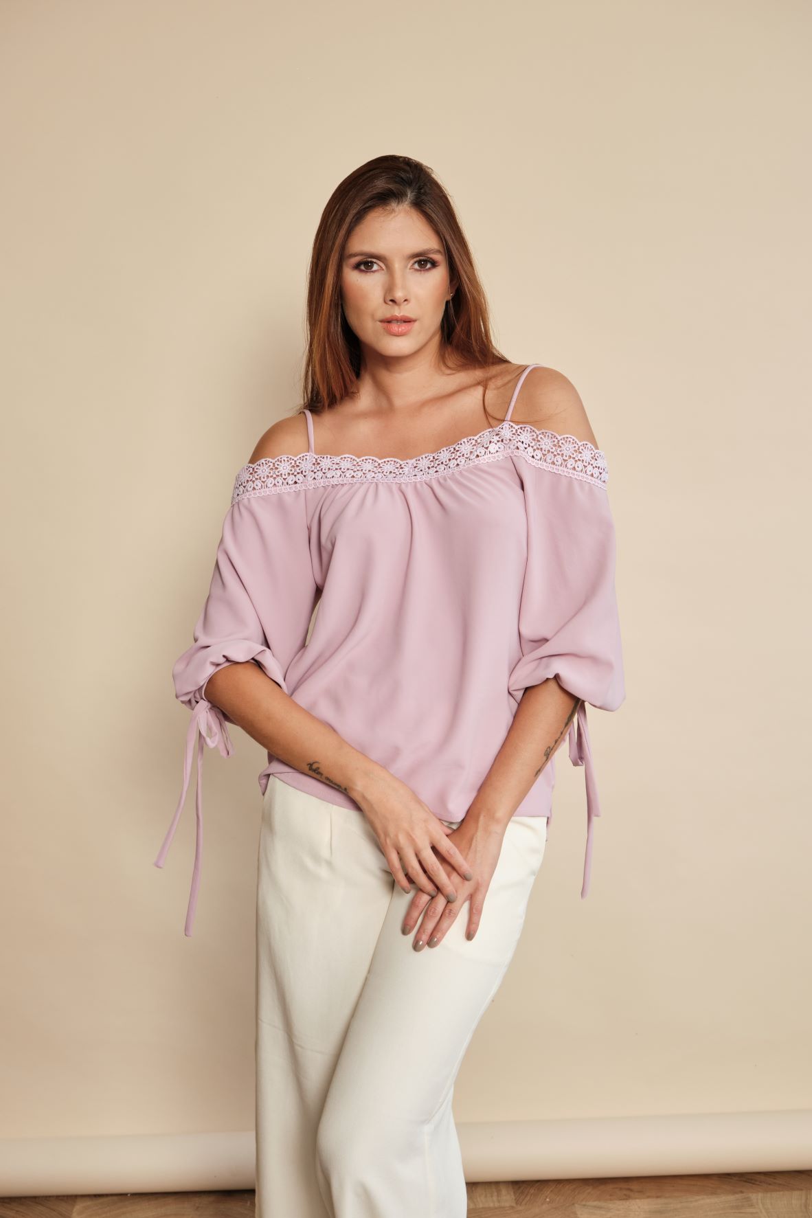 Base Textil: Seda Poliéster 100%. Blusa campesina de silueta amplia con bolillo en contorno y tiras de seguridad en los hombros, manga 3/4 con tiras para amarrar. Color: Ivory y Lila.