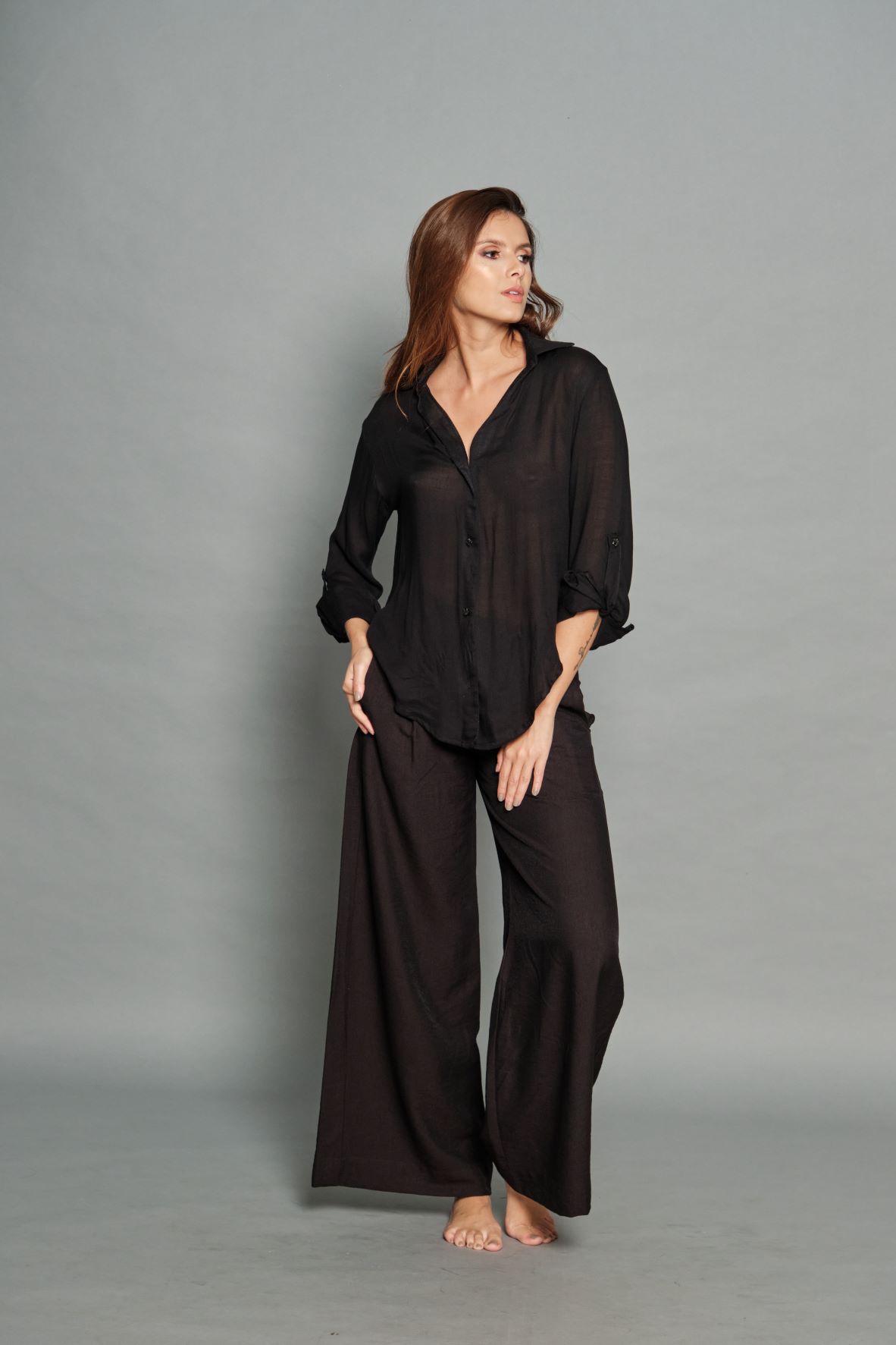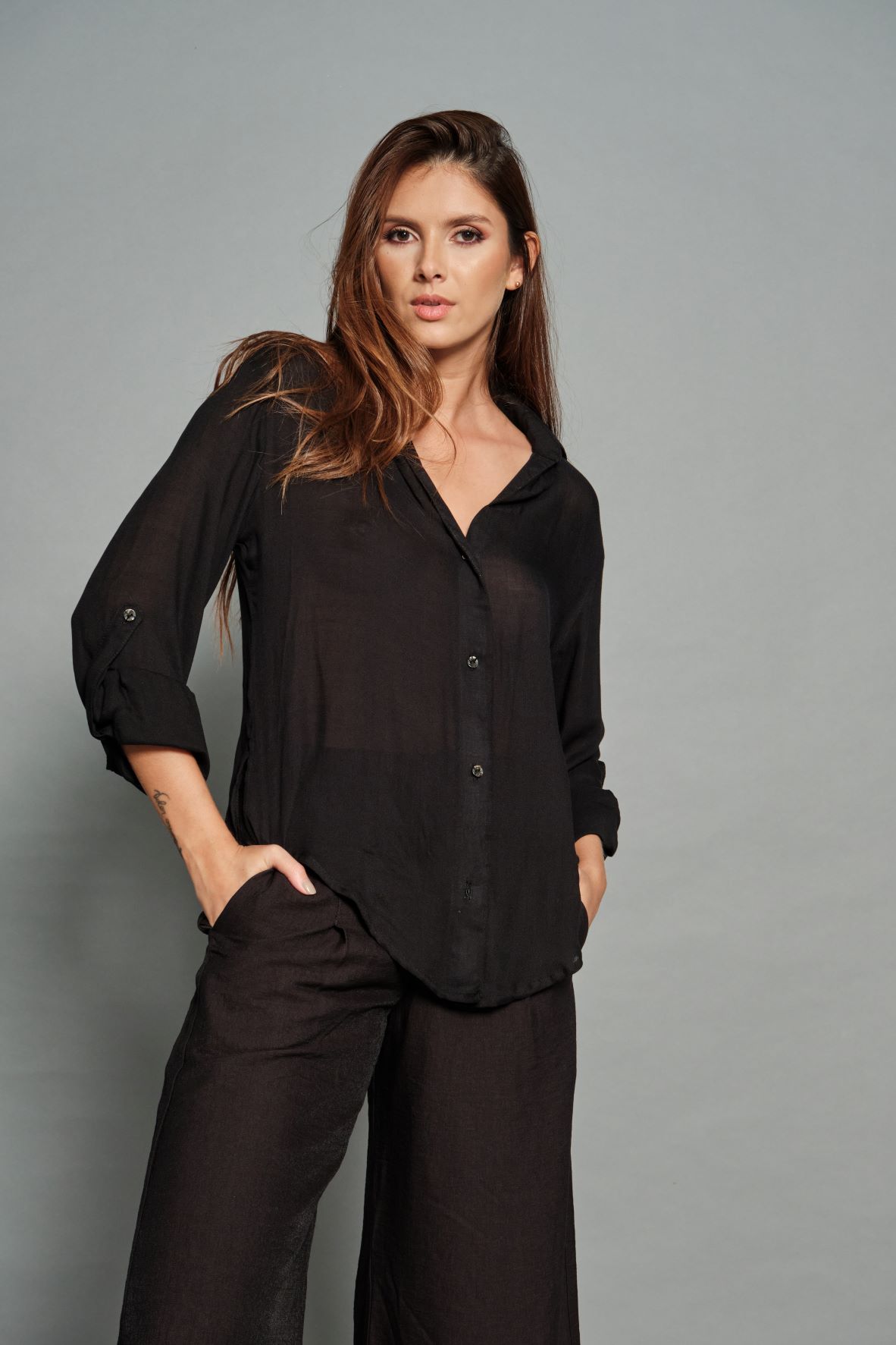 Base Textil: Rayón 100% tela tipo gasa con transparencia. Blusa de cuello camisero con botones en frente, manga larga con puño, faldones delanteros mas largos para usarla también amarrada en frente, espalda lisa. Color: Blanca y Negra.